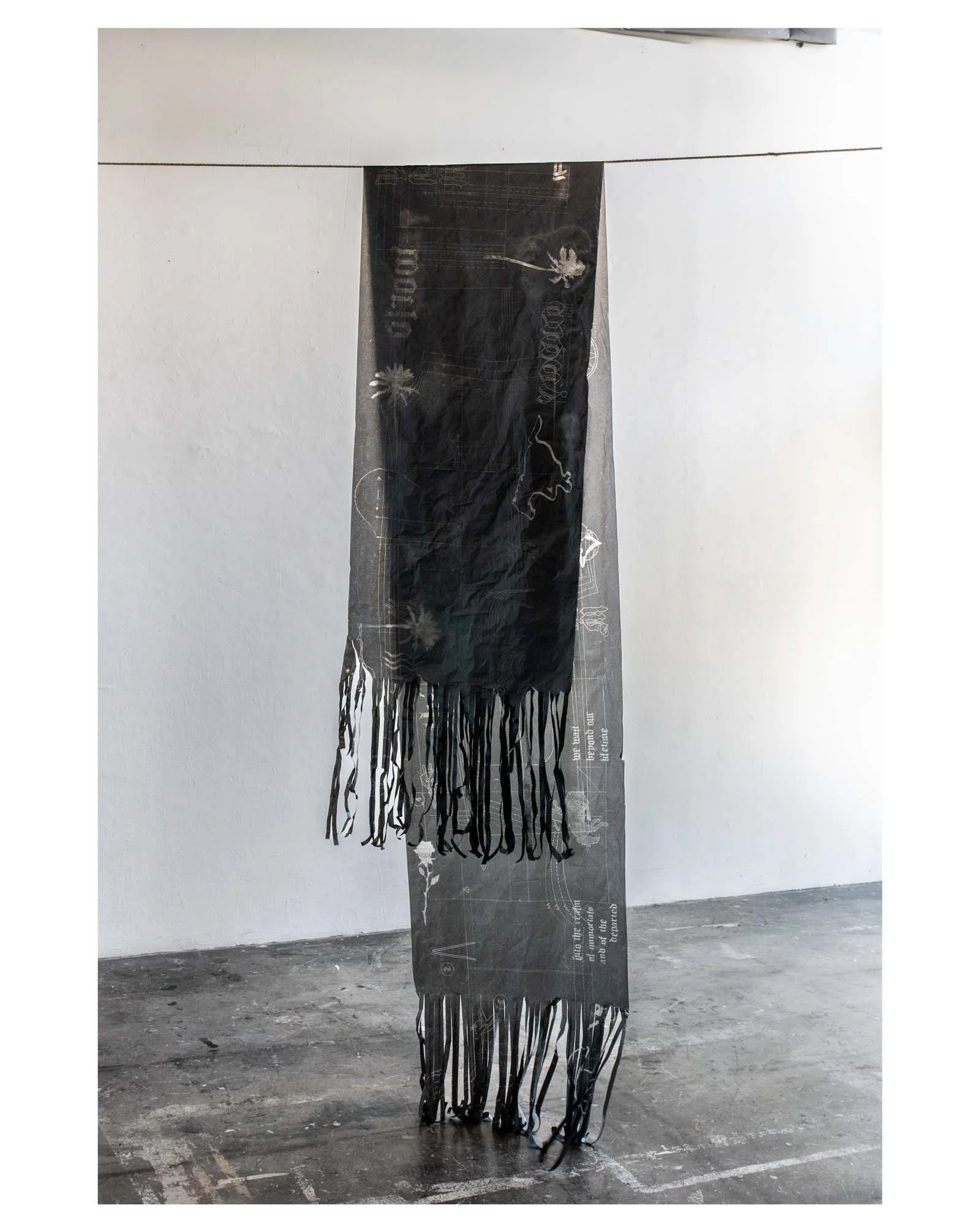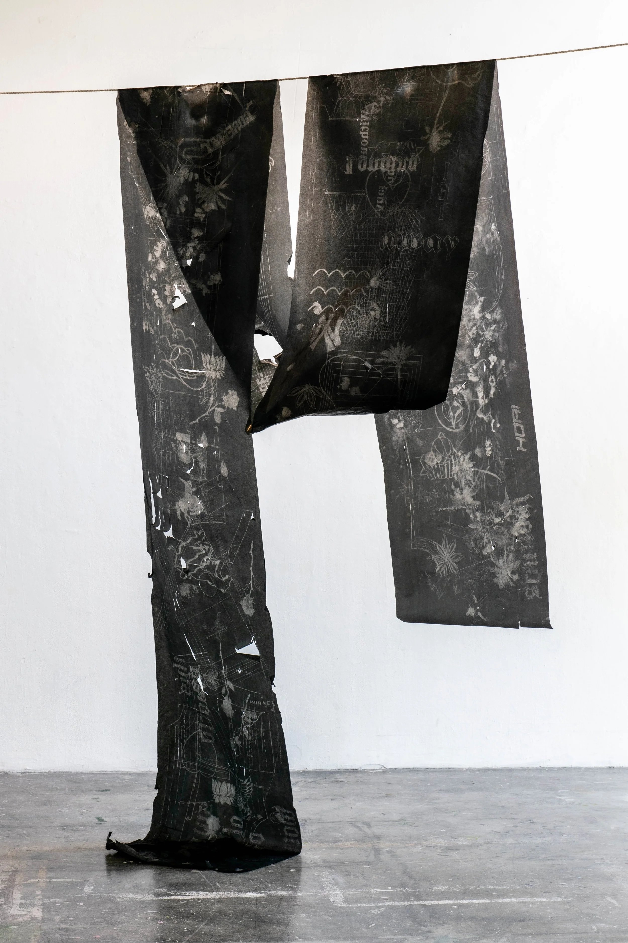 Her Name Means Eternal (front, left and back, right), 2023 embroidery, fabric, ink, graphite, reflective paint on canvas 83 x 53 in. each