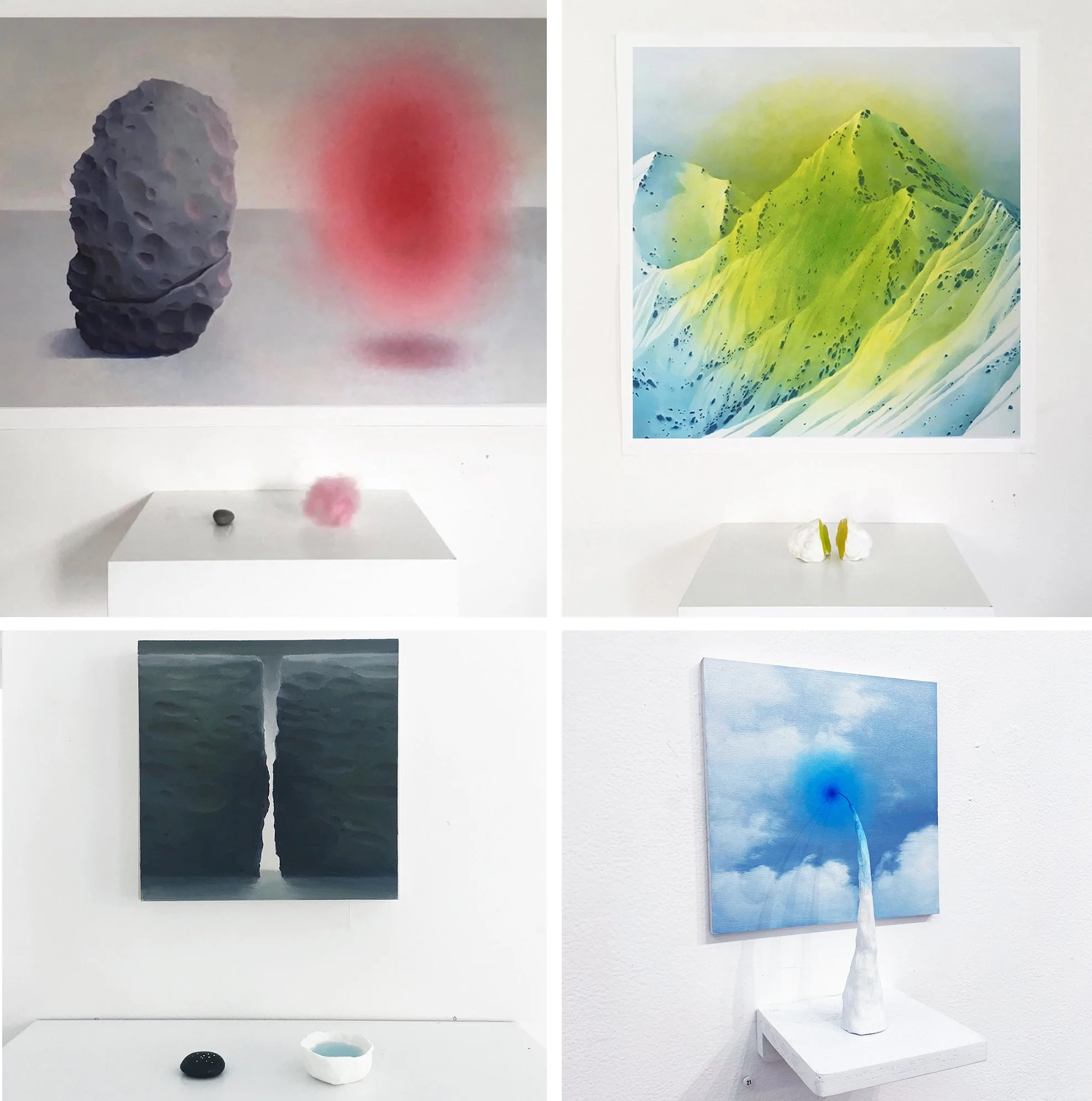“When I was a child, I was extremely shy, and I dreamed of being able to communicate through bioluminescence or by quietly passing information through a network of fungal filaments rather than with spoken words. These desires evolved into a fascination with alternative languages and methods of connection, as well as a deep curiosity about the inner lives of creatures. Today, I study the sentience and vocabulary of rocks, beetles, clouds, and other beings. In my studio, paintings and sculptures reach toward each other, blush at each other, antagonize each other, flirt with each other, and sometimes sit, shyly, side by side. My central goal as an artist is to discover alternative, more vibrant ways of being human and connecting with other creatures.”