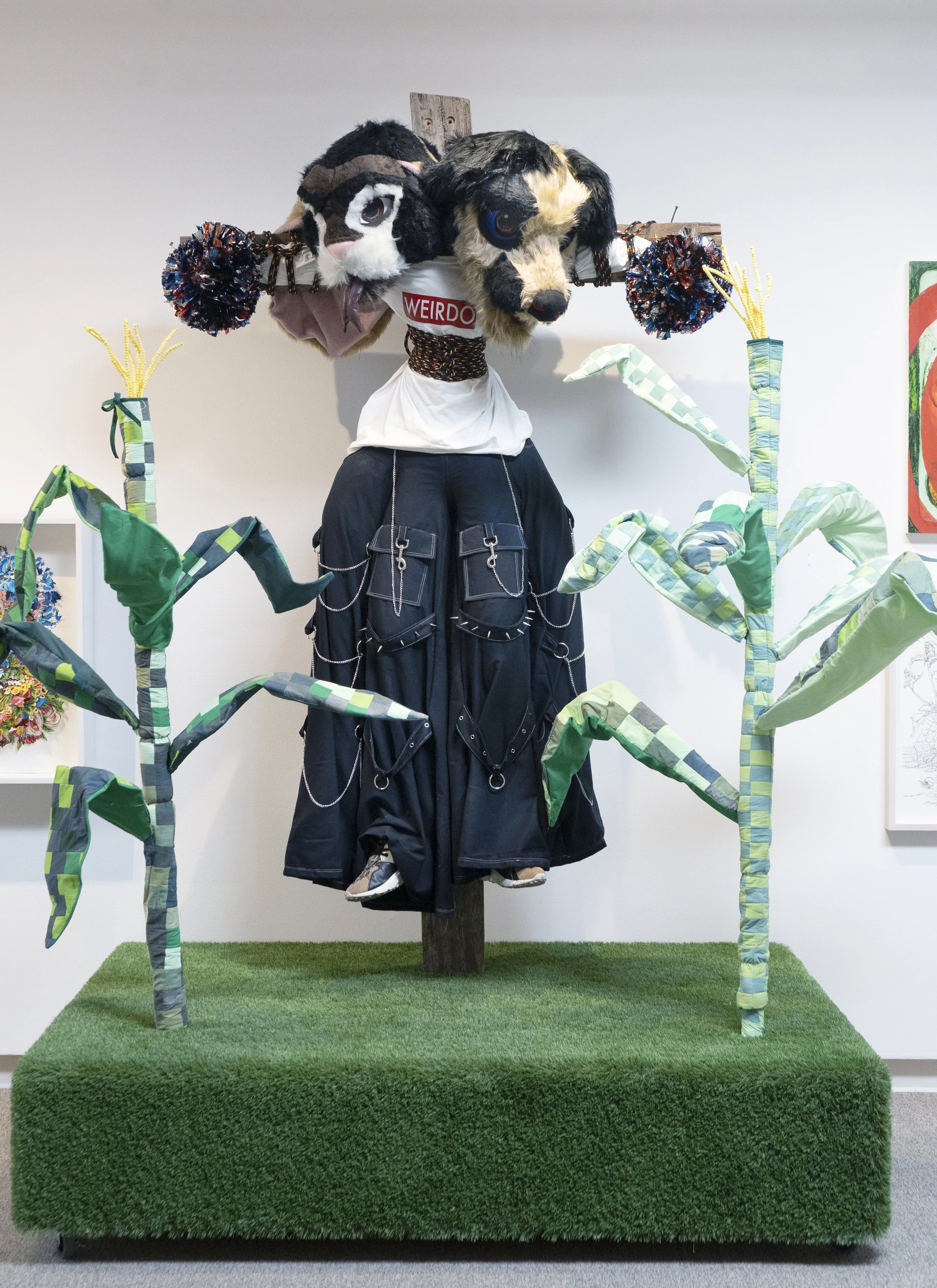 Scarecrow #4, Fur suit head, turf, wood, fabric, rope, pvc, clothing, 2022