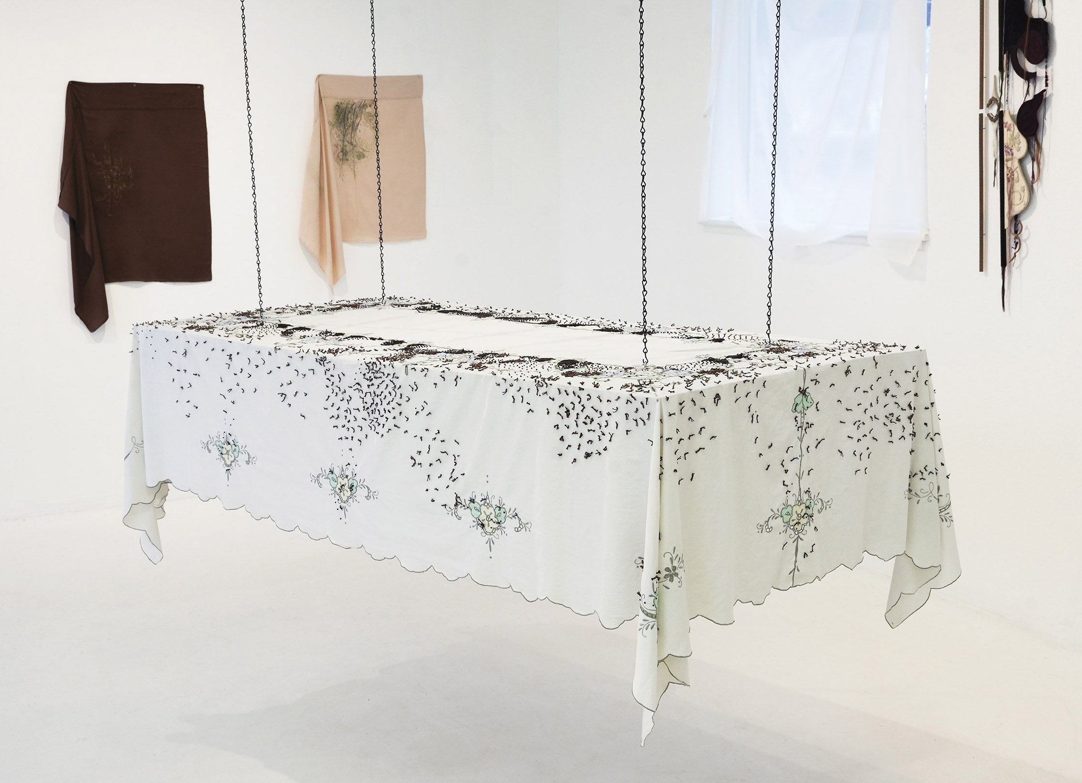 Artist studio (foreground): Dinner Got Cold, The Past Will Always Be Present Series, 2025, masonite, fabric, embroidery floss, 64 x 30 x15 in.