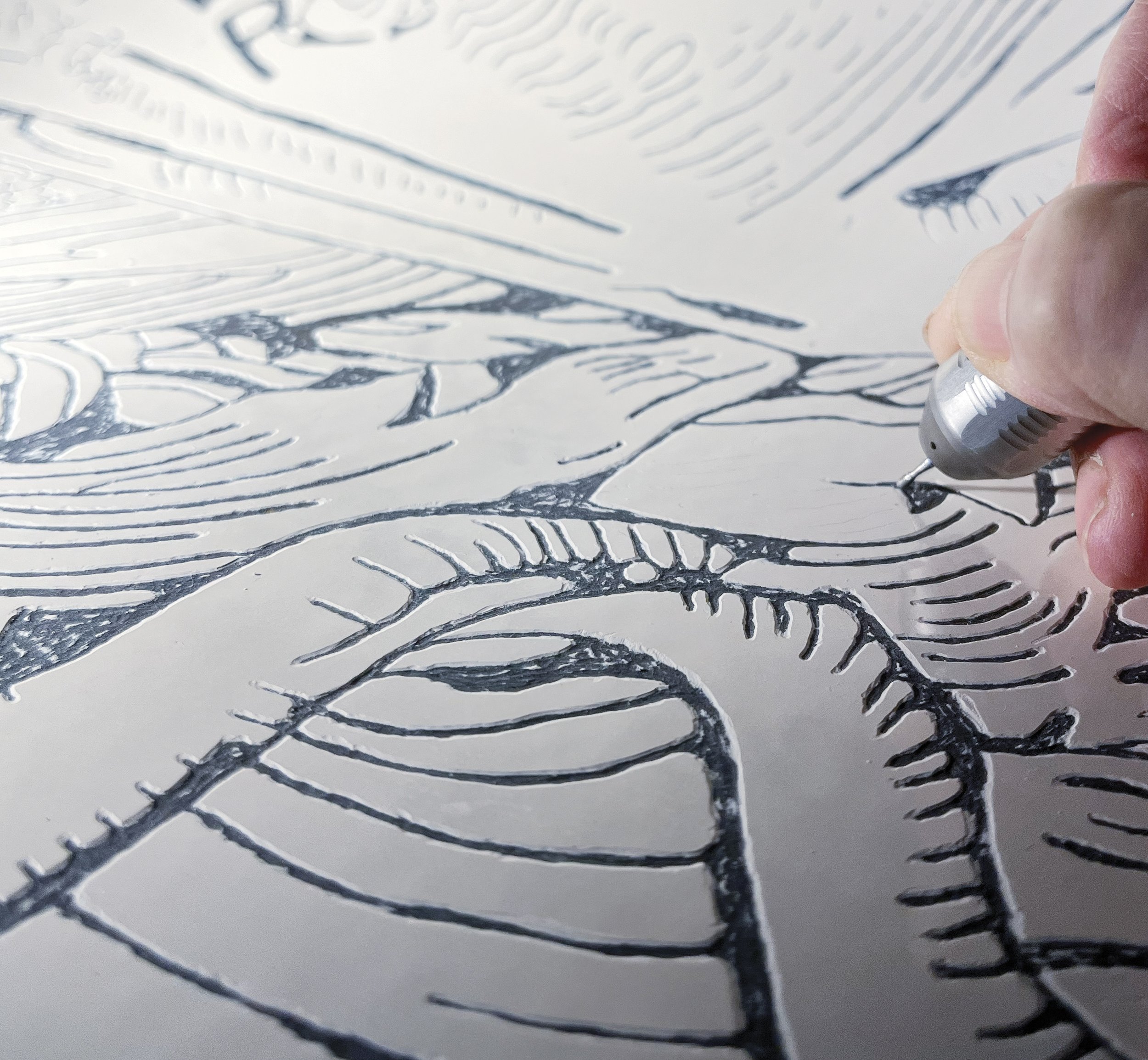 Farnaz Shadravan engraving her current work in progress, white areas are the superimposed image to be engraved: The Whore of Babylon, 2025 (in progress), engraved porcelain bathtub, 60 x 30 x 14 in.