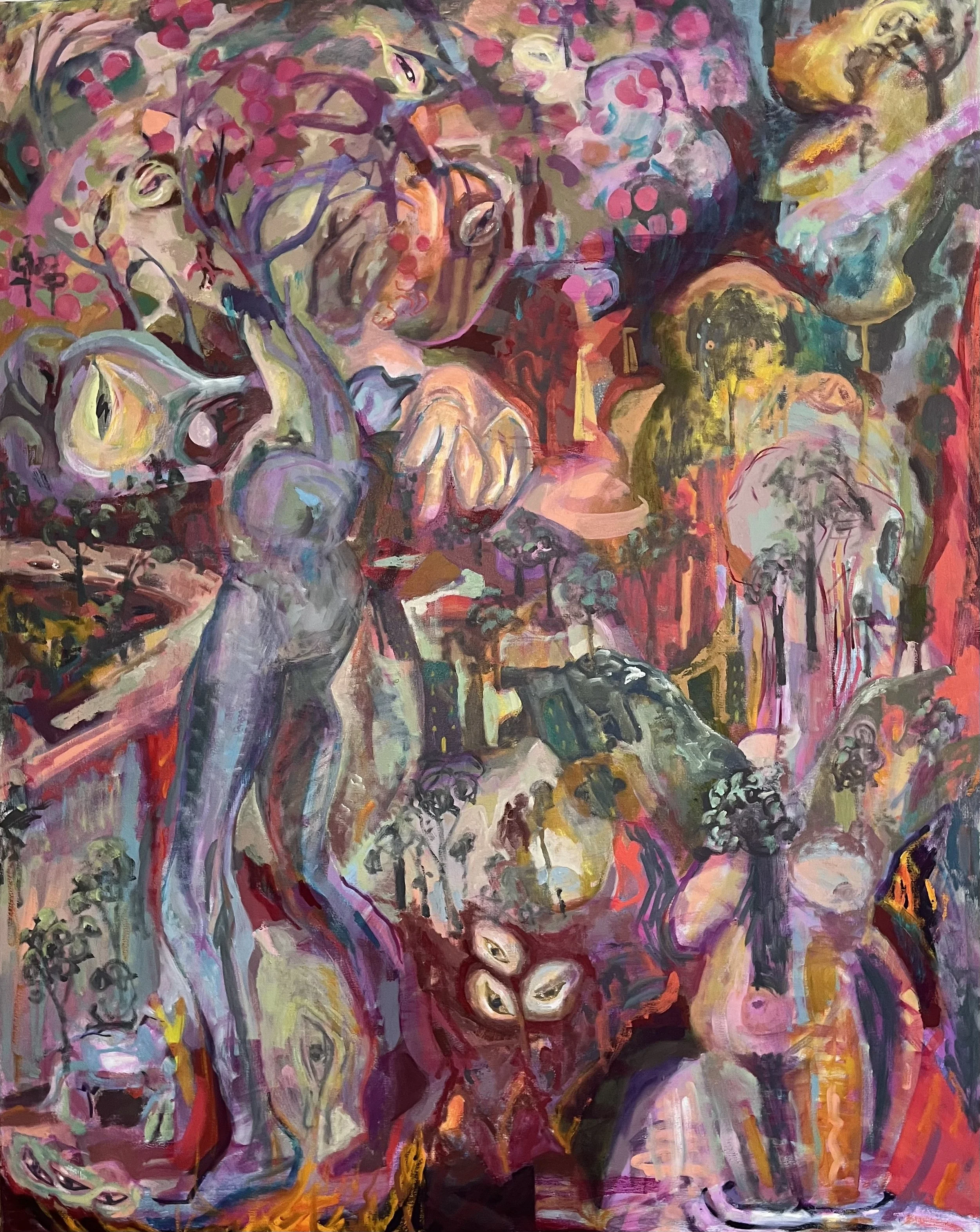 To tackle the colossal subject of climate change, Fader paints worlds inhabited by creatures whose interactions read as cautionary tales. While the mood may be foreboding, they glow and are rich in texture and sensation, featuring smaller narratives woven into the larger movements. They also have a comic macabre quality, mirroring our own derangement. The paintings exist in a suspended time, a dystopia, where humans are no longer the dominant species. Hints of world events and environmental devastation are present, but they are not fully understood or explained. These narratives are playful yet profound, inviting yet disorienting. As dualities unfold, the paintings create a parallel reality of recognition, memory, and hope.
