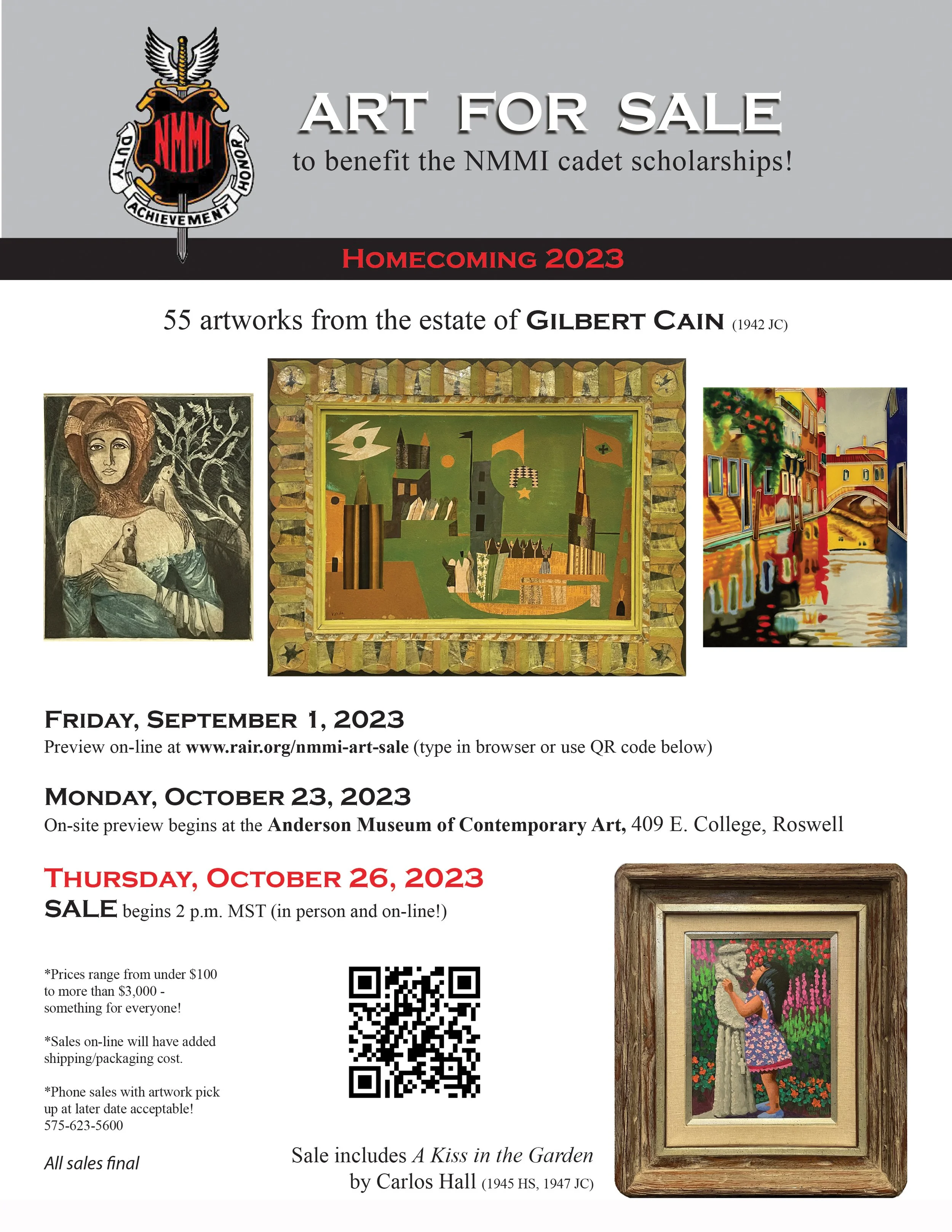 AMoCA has teamed up with the New Mexico Military Institute Alumni Office to sell donated artwork from the estate of Gilbert Cain, a NMMI alumnus from the 40's who passed away in 2009. The 55 works are interesting to browse through - which everyone can do by perusing rair.org/nmmi-art-sale! The physical objects will be on display on temporary panels at AMoCA starting October 23rd, with the sale officially starting at 2 p.m., October 26 (MST) - the first day of NMMI's 2023 Homecoming. AMoCA will gain on-line exposure with NMMI's vast alumni as well as new visitors during the Homecoming weekend. We appreciate the opportunity to facilitate this sale and gain experience with on-line art sales! Click here to see the artwork.