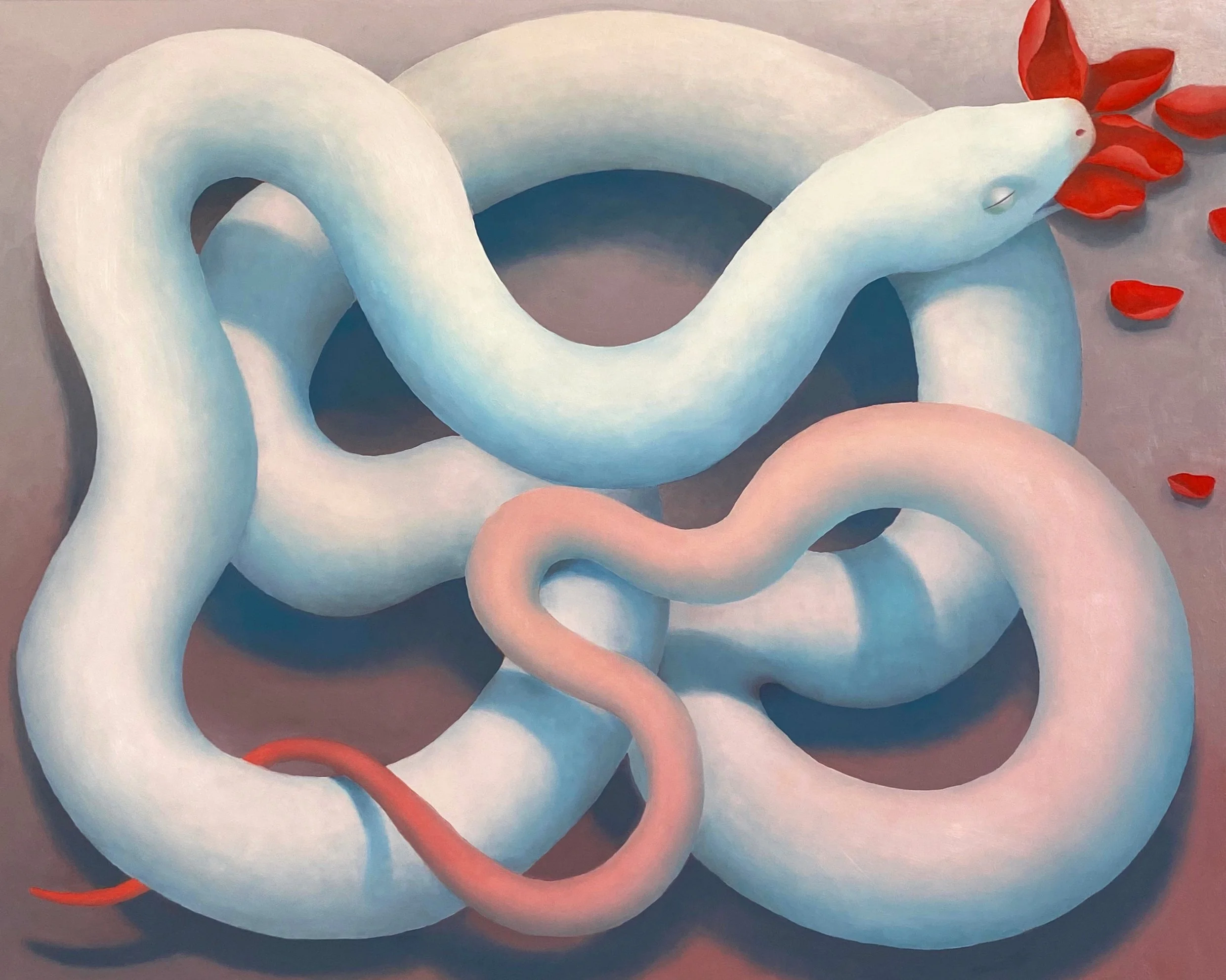 Gentle Snake Eating a Flower, 2025, oil on panel, 24 x 40 in.
