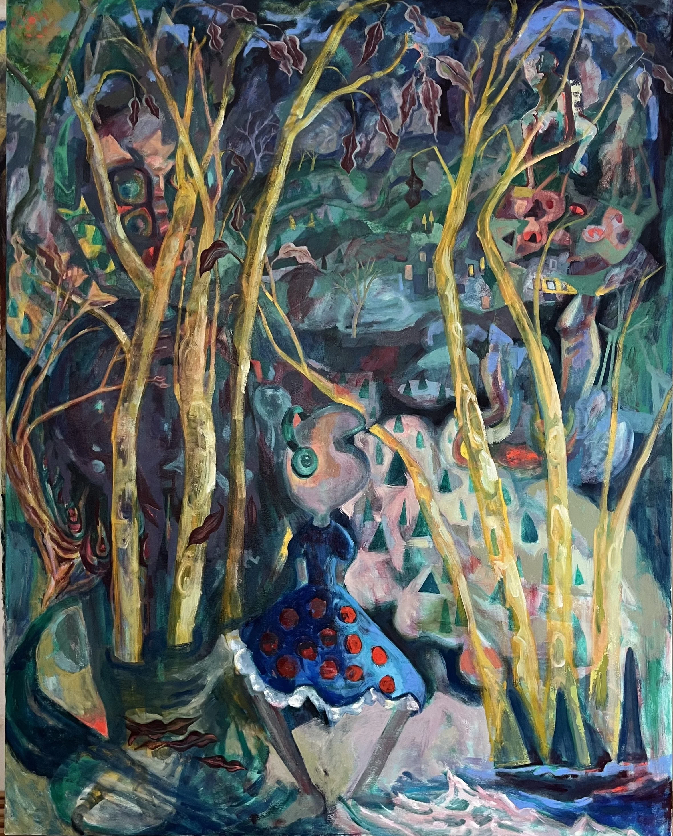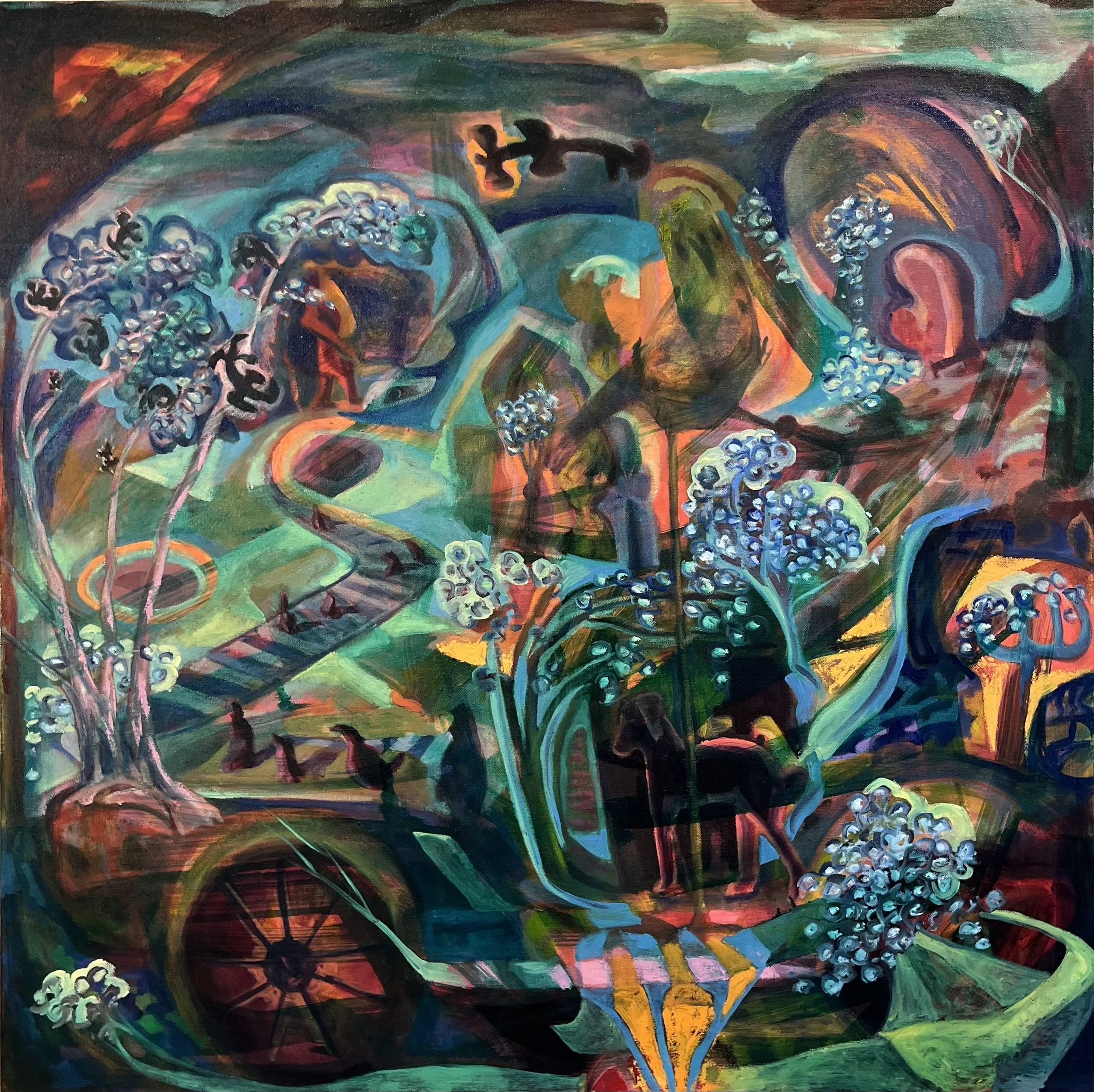 Using erratic, curvilinear compositions, I construct vivid, immersive environments that invite viewers to enter and linger. A piece might begin with a familiar motif—a winding road or pastoral scene—only to unravel into something unexpected and uncanny. I work intuitively, layering and reworking until the image reveals something surprising, something alive. Though signs of ecological crisis—floods, fires, darkened skies—may surface, they emerge through chaotic and dynamic transformations rather than overt narrative. These constant shifts in form and color give rise to Jungian archetypes within unsettling, sometimes comic, dreamscapes.